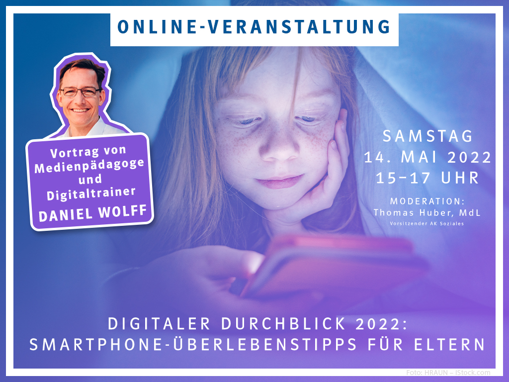Die Online-Veranstaltung der CSU-Fraktion im Bayerischen Landtag am Samstag, den 14. Mai von 15 bis 17 Uhr gibt Eltern wichtige Informationen für einen möglichst konfliktarmen und verantwortungsvollen Umgang mit digitalen Medien in Familie und Schule.Der renommierte Medienpädagoge und Digitaltrainer Daniel Wolff (bekannt aus ARD, BR, SZ und Antenne Bayern / www.digitaltraining.de) hat zudem viele praktische Tipps parat, die Sie gemeinsam mit Ihren Kindern sofort ausprobieren können!